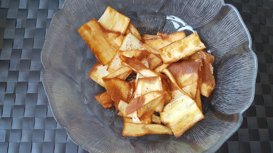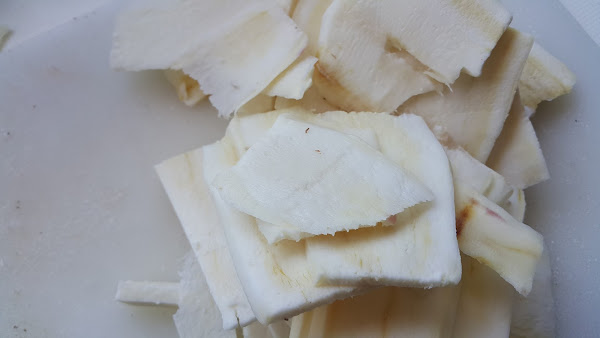 Pelamos la yuca con cuidado ya que la piel es muy dura. Cortamos la yuca en láminas quitando el núcleo ya que es muy duro.