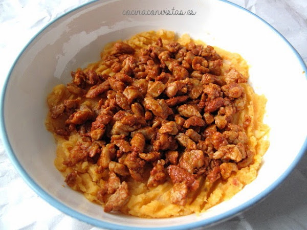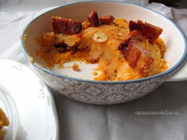 En la fuente donde vayamos a servirlo (mejor si puede ir al horno, o al microondas por si hay que calentar en el último momento) pondremos primero una capa de yuca revolcona encima picadillo de magro, cubrimos con otra capa de yuca y rematamos con los torreznos crujientes de panceta.