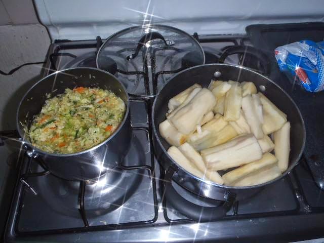 Corte la yuca en pedazos de aproximadamente 8 cms. de largo, pélela y luego pongala a salcochar con suficiente agua y le agrega los ajos. cuando la yuca ya está blandita agregue 1/4 cucharadita de sal y la deja hervir unos 3 minutos mas.