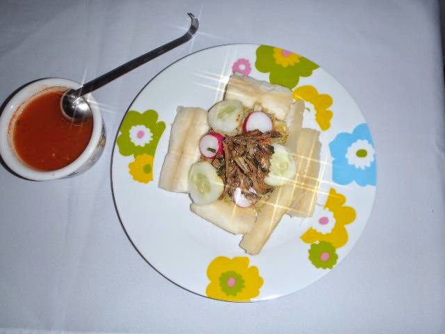 Para servir su plato de yuca, parta los pedazos de yuca por mitad, y coloquelos en el plato, encima de la yuca coloque su escabeche, luego coloque sus pesacditas fritas, y finalmente coloque la salsa en una pequeña fuente donde cada persona pueda servirse la salsa a su gusto. Este es un platillo para disfrutar a media tarde como antojo o para cenar en familia. Espero les guste. Que lo disfruten. Cualquier pregunta no dude en hacerla.