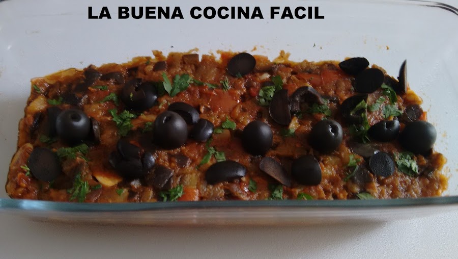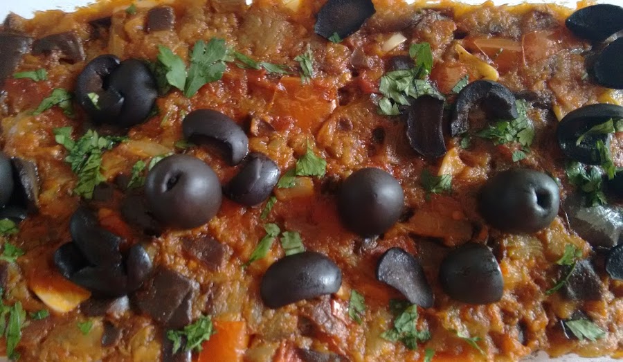 Añadimos las berenjenas, rehogamos 10 o 12 minutos, retiramos del fuego, ponemos un chorreón de aceite de oliva por lo alto (Opcional), ponemos aceitunas negras en rodajas por lo alto y perejil o cilantro picado, y listo para comer, se puede comer frío, caliente o a temperatura ambiente.