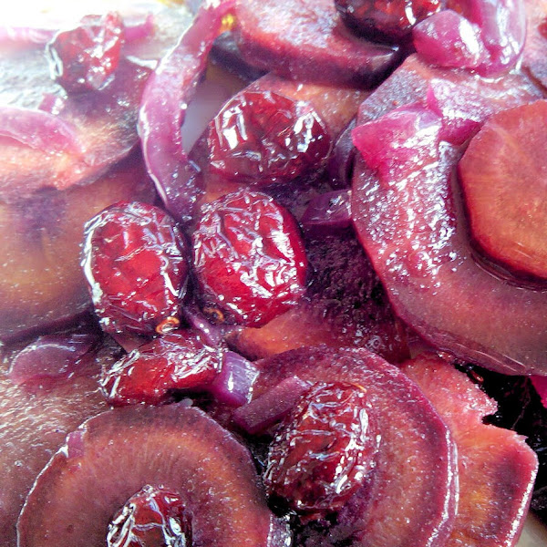 Lleva el fondo de la cacerola con aove del güeno, un puñáo de arándanos deshidratados, 1cdita. de jengibre, 5 pimientas de jamaica majadas con sal, 1 ají picante, 1 cebolla mediana cortadita y 4 zanahorias morás en rodajas. Cocer todo junto a fuego flojo hasta que te guste la textura de la zanahoria (a mi me gusta crujiente) unos 20´. Removiendo de vez en cuando. Añadí una cucharada colmada de miel y una pizca de azúcar, dejé cocinar por unos 10´más a fuego un poco más elevado pero sin quitarle ojo a la cacerola y removiendo de cuando en cuando.