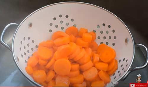 En primer lugar, lavamos y quitamos los restos de tierra a las zanahorias. Las pelamos y las cortamos en rodajas de 1 centímetro aproximadamente.A continuación, en una olla ponemos abundante agua y cuando empiece a hervir ponemos un poco de sal e incorporamos las zanahorias cortadas. Las dejamos cocer durante 10 ó 12 minutos.