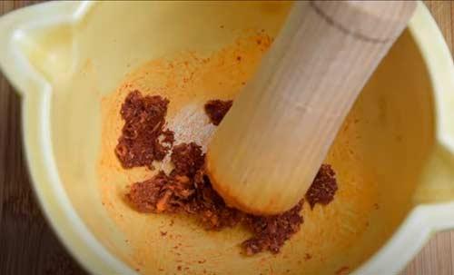 A continuación, ponemos los 3 dientes de ajos pelados en un mortero, añadimos la sal, el comino en grano, el pimentón y el orégano. Majamos bien hasta que nos quede una pasta.Ahora, le añadimos el vinagre de Jerez, el aceite de oliva y el agua y lo mezclamos bien.