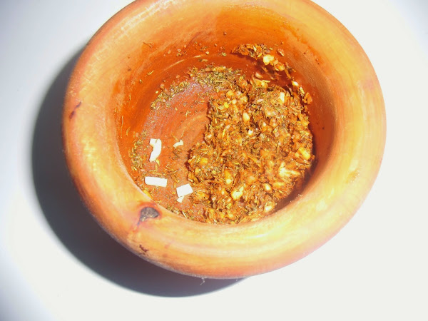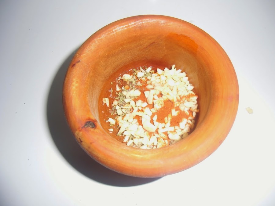 En un mortero machacamos los ajos pelados y cortados con una cucharada de comino, otra de orégano, una cucharadita de pimentón, sal, y unas gotas de vinagre