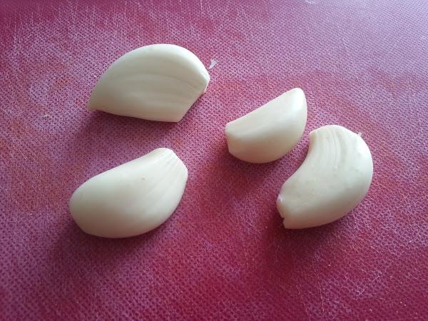 3. - Mientras hierven, picamos el ajo muy finito. Yo sólo los pelo y utilizo un triturador de ajo.