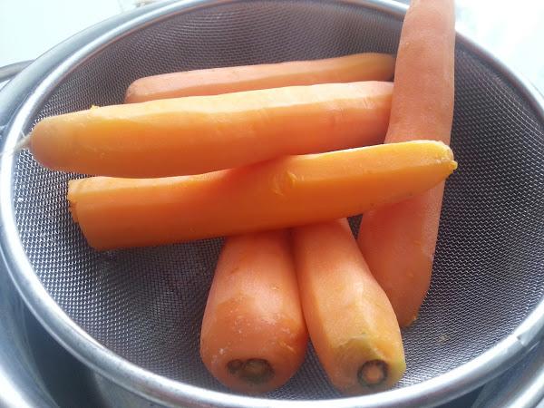 4. - Una vez cocidas las zanahorias, las escurrimos y esperamos a que se templen. Entonces las vamos cortando en rodajas.