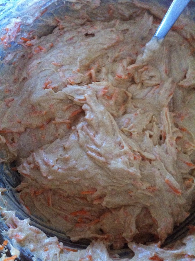 Removemos hasta que los ingredientes secos se integren totalmente con los húmedos,y cuando tengamos una mezcla uniforme,añadimos la zanahoria rallada,integrándola con la mezcla anterior.