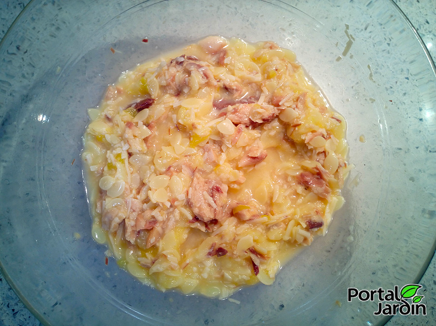 Mientras, unimos el resto del relleno: el huevo batido junto con la caballa y el queso. A ésto añadimos la pulpa que estaba escurriendo.