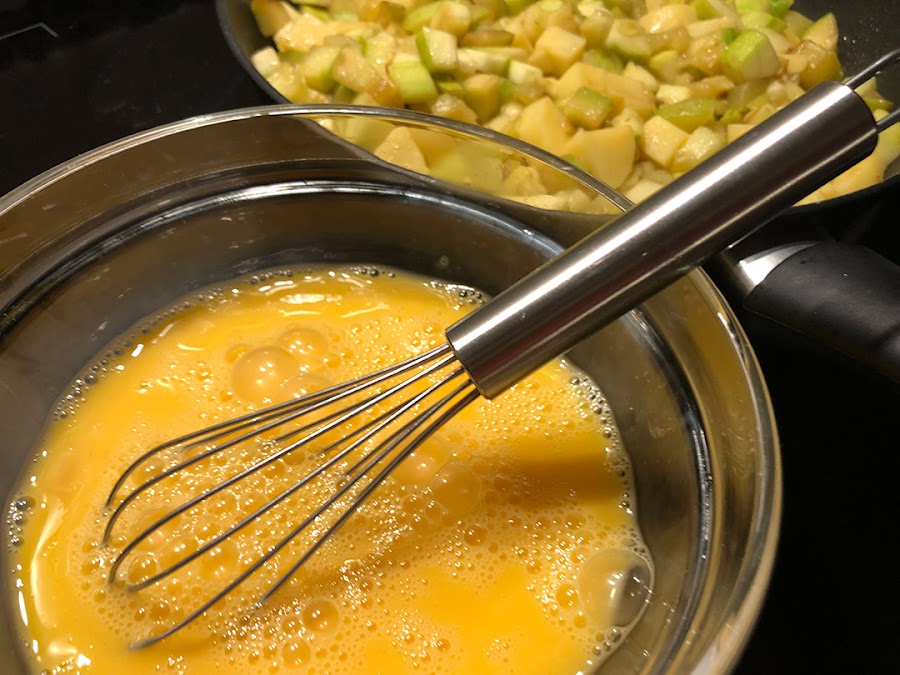 Una vez está la verdura blandita añadimos los 3 huevos batidos y movemos todo bien para que se nos quede revuelto, no en tortilla.