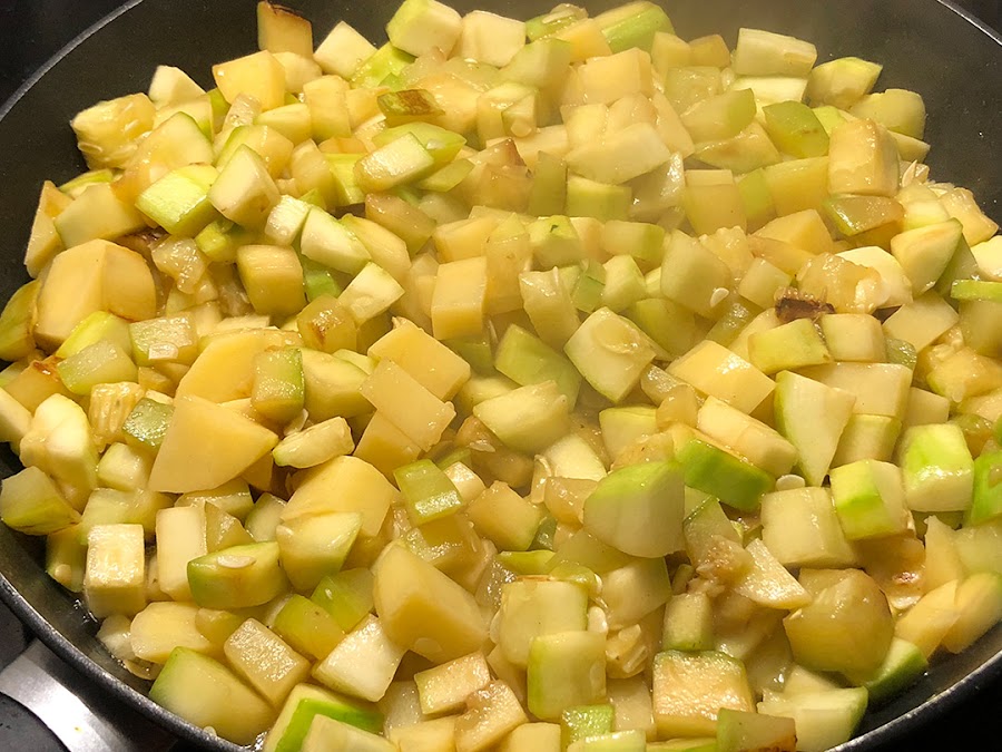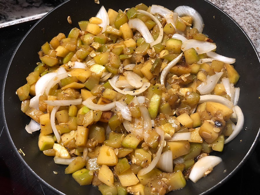 Cuando veamos que el calabacín y la patata ya empiezan a estar algo más blanditos incorporamos la cebolla y removemos todo.