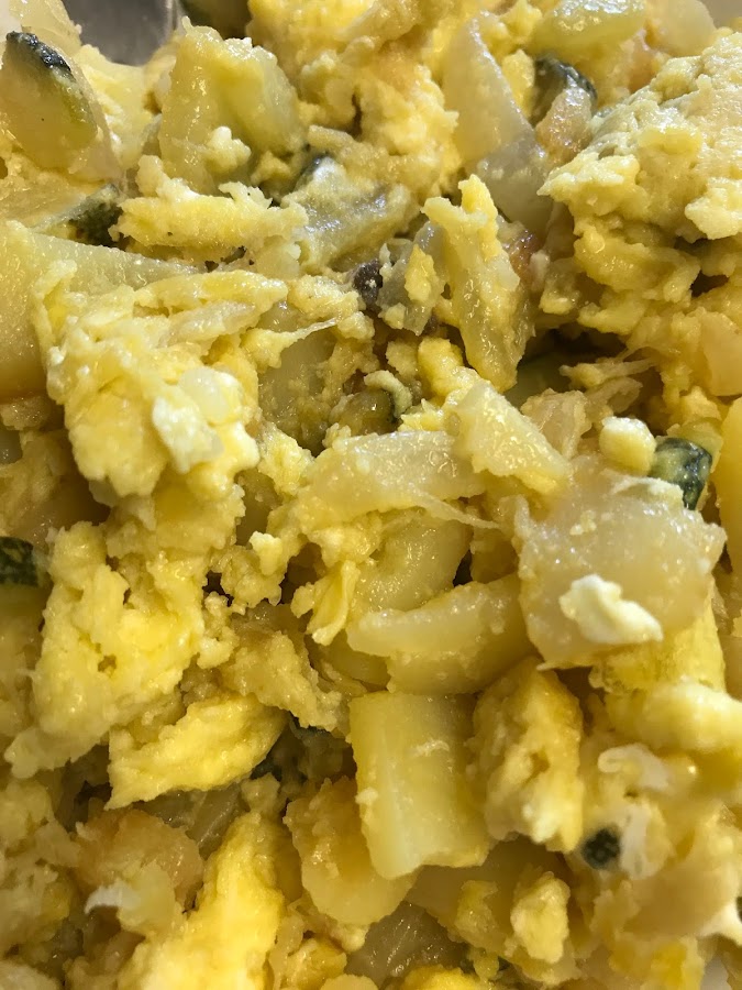 Movemos, evitando que se asiente y que se cuaje, hasta obtener ese aspecto de huevos revueltos. Para muchos, en la foto de arriba ya estaría para apartar (jjjj). Si lo prefieres más bonito, mi abuela lo acabada como una tortilla.