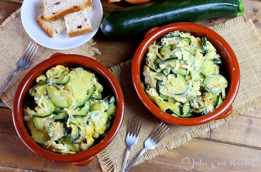 Batimos los huevos salpimentados y los añadimos a los calabacines, rehogamos durante 2 minutos, procurando que no quede el huevo demasiado seco y listos para servir.