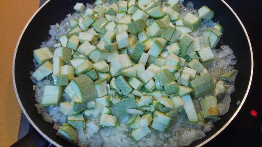 Ahora picamos los calabacines (en el zarangollo original los calabacines van cortados en rodajas pero yo los troceé). Salamos.