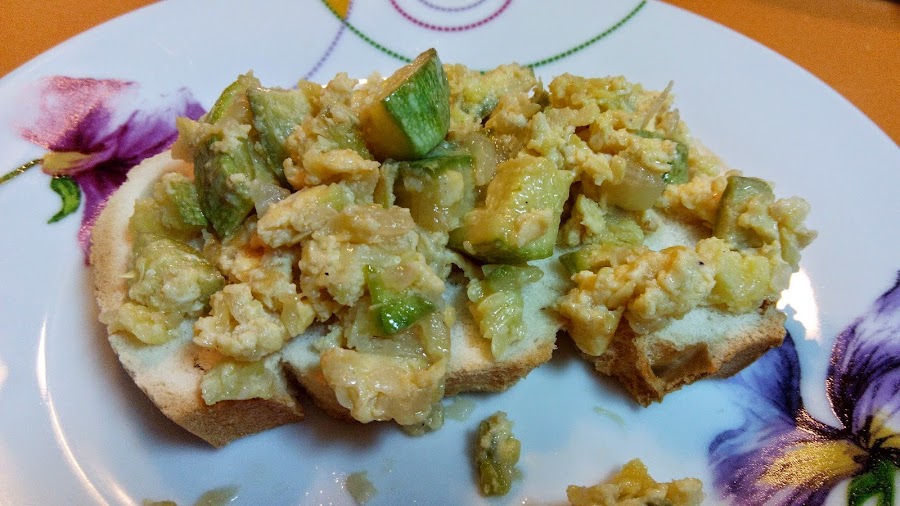 Cuando las verduras estén listas, echamos los huevos batidos, removemos y servimos. Por lo visto la costumbre es servirlo encima de una rebanada de pan tostada.