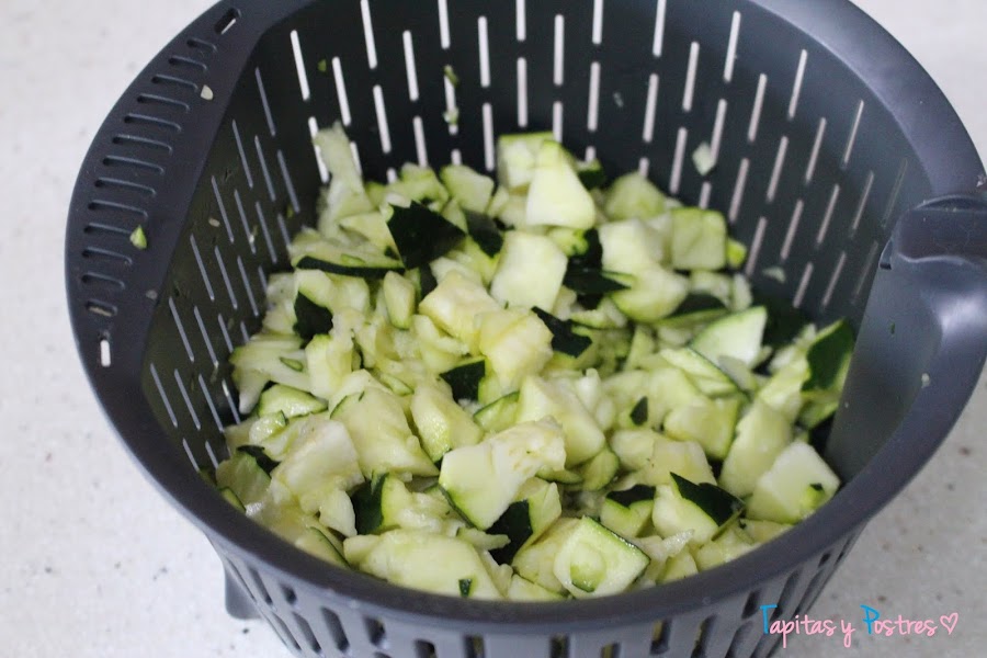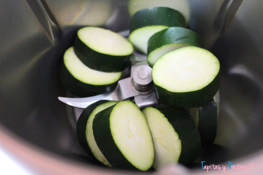 Lavamos bien el calabacin y sin pelarlo, quitamos los extremos y lo troceamos a ruedas grandes. Lo ponemos en el vaso de la thermomix y troceamos 3 segundos a velocidad 4. Sacamos y reservamos.