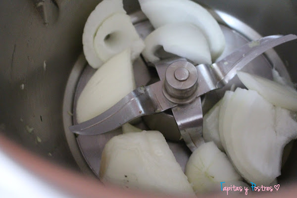 Cortamos la cebolla en cuartos y la ponemos con el aceite en el vaso. Troceamos 3 segundos a velocidad 4 y luego sofreímos 15 minutos, varoma, giro inverso y velocidad cuchara.