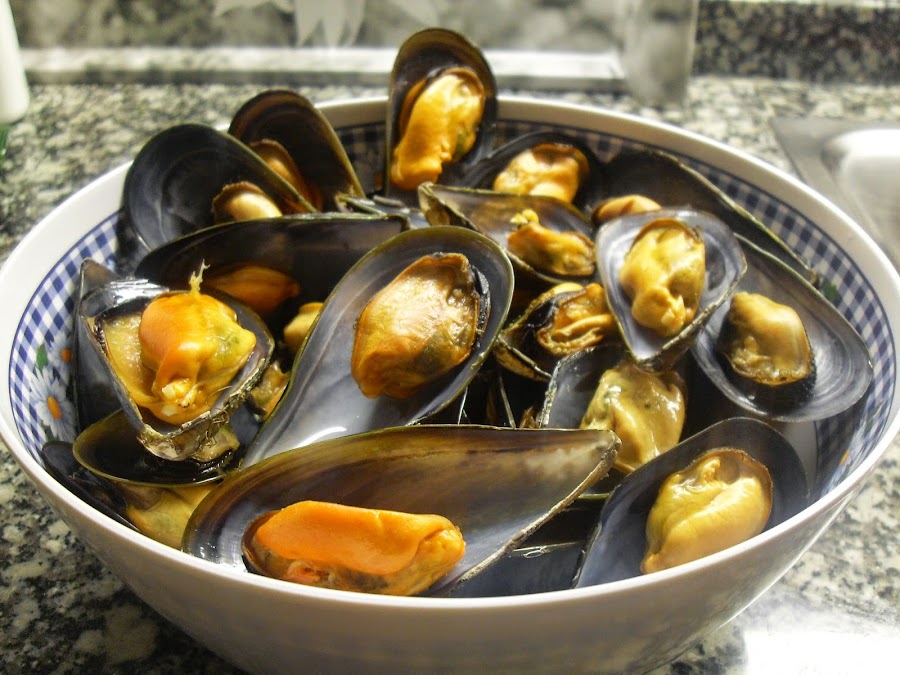 Cocer al vapor los mejillones limpios de barbas y quitar una parte de la cáscara , a parte cocer las almejas. Reservar el caldo de ambos.