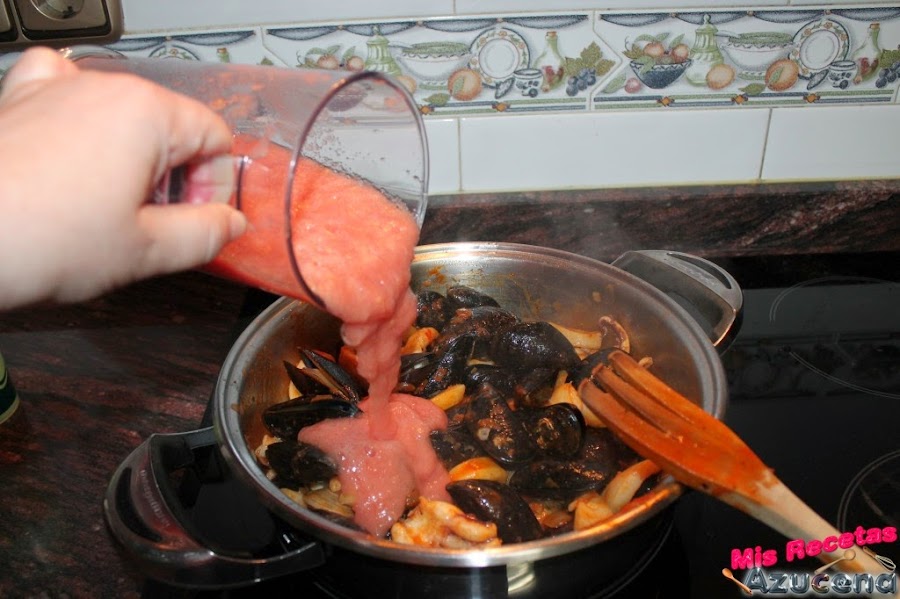 Cuando estén los mejillones y las chirlas abriéndose añadiremos el tomate, removemos todo y dejaremos hasta que casi reduzca, tiene que quedar jugo en el fondo.