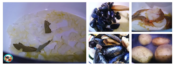 2.- Pelamos y picamos la cebolla en dados pequeños, en un cardero añadimos un poco de aceite de oliva. Sofreímos la cebolla sin que llegue a dorarse, añadimos la hoja de laurel, un poco de sal, las almejas escurridas y los mejillones. Los cocinamos unos minutos hasta que habrán. Retiramos del fuego y reservamos. ( Desechos los mejillones que no se abren, y no cocinamos los que ya están abierto. también los desechamos).