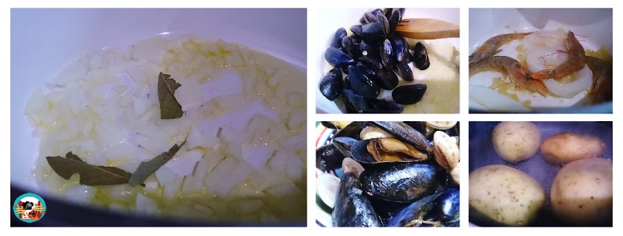 1.- Lavamos bien las papatas, y las ponemos a cocer con la piel en agua con sal y 1 hoja de laurel, durante 40 minutos. Escurrimos y reservamos. Lavamos los mariscos, los escurrimos bien, las almejas las dejamos 20 minutos en agua y sal para limpiarlas de la arena y las impurezas que tienen en el interior.
