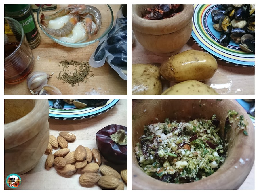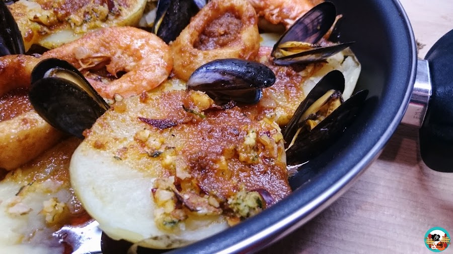 5.- Hacemos un majado con la ñora, (picada sin las semillas) las almendra y una pizca de sal. Vertemos un poco de vino blanco y los distribuimos sobre las patatas. Precalentamos el horno a 180C y cocinamos las patatas 10 minutos en el horno, retiramos del horno y distribuimos sobre las patatas los mariscos con el mojo. Cocinamos 10 minutos más. Servimos enseguida.