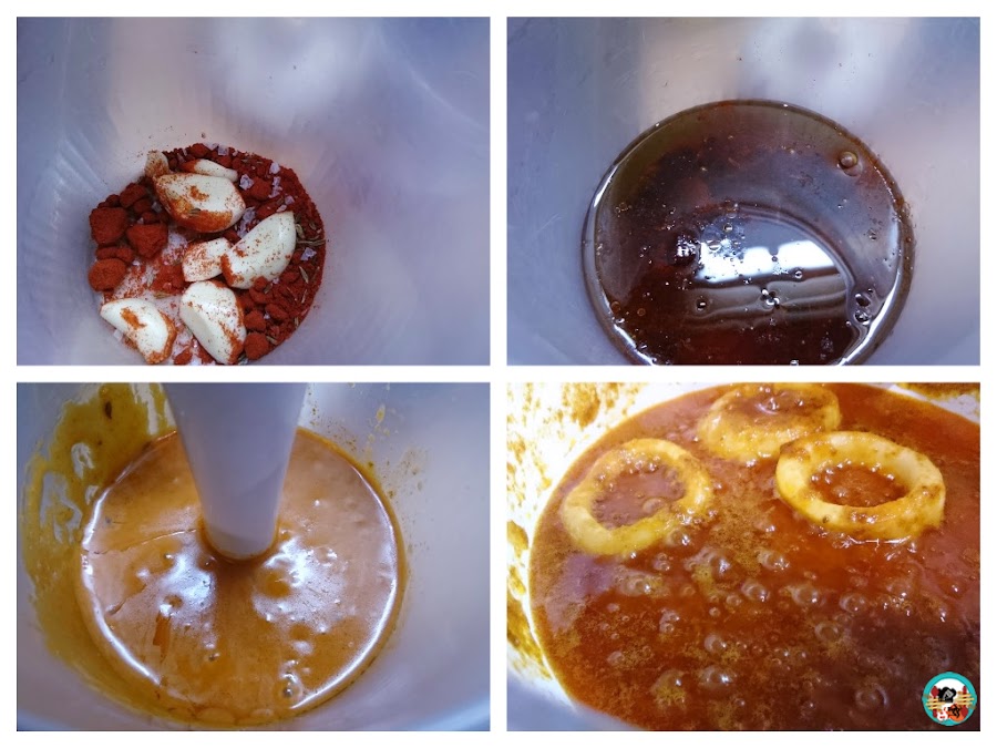 Preparamos el mojo con los ingredientes del mojo, los ponemos en un baso y los trituramos con el brazo. Vertemos el mojo y cocinamos los calamares 15 o 20 minutos hasta que estén tierno.