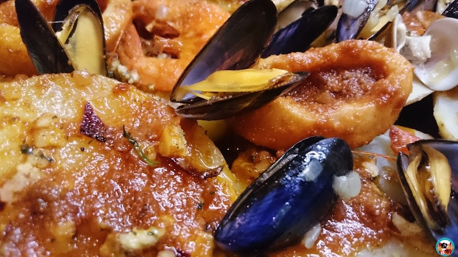 Zarzuela de mariscos con mojo canario y fondo de patatas (papas) cocidas. Imagino que hay muchas formas de hacer una zarzuela de mariscos y que todas tienen que estar buenas. Las he visto con distintos pescados...la mía lleva mojo rojo y papas cocidas (patatas).