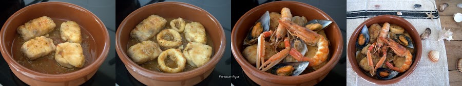 En una sartén con un poco de aceite dorar las cigalas y las gambas. Incorporar a la cazuela, junto con las almejas y los mejillones, cinco minutos antes de finalizar.