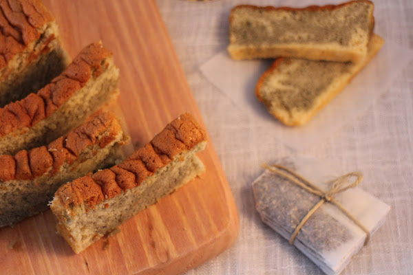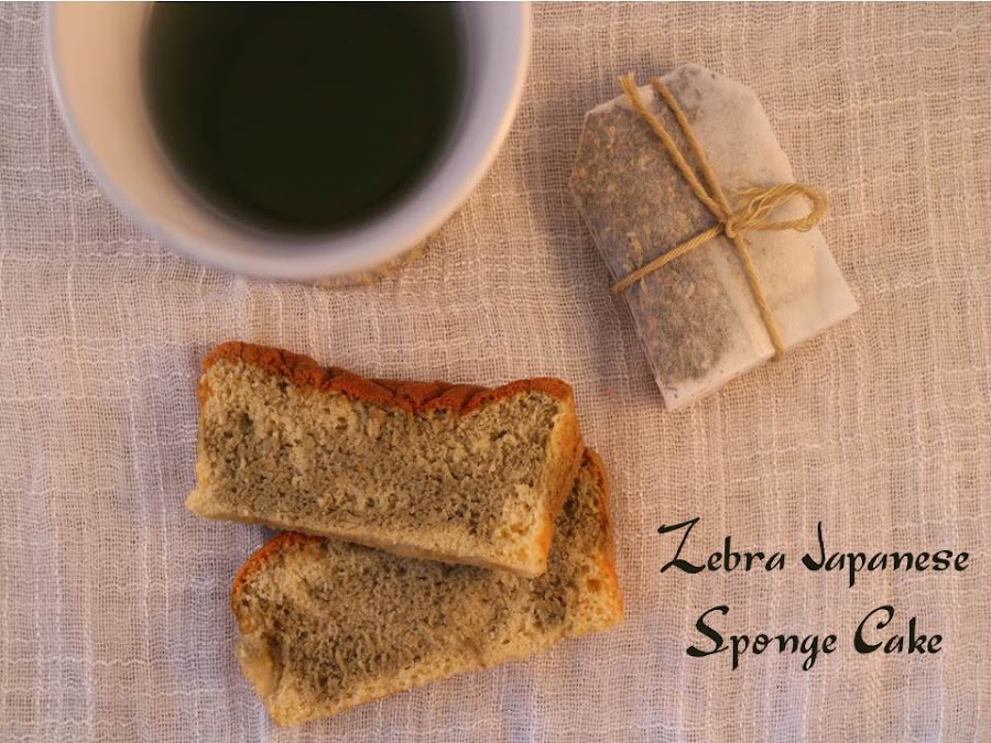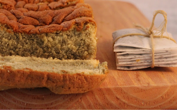 El color del bizcocho original era de un verde intenso debido a su elaboración con té verde matcha en polvo que también es de origen japonés y el té que yo he utilizado es un té verde con jengibre y naranja de la variedad de "Tés saludables" de la marca Pompadour en hoja (de los que vienen envasados en bolsitas).