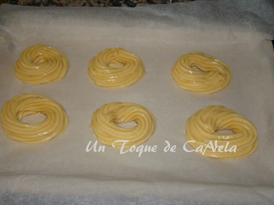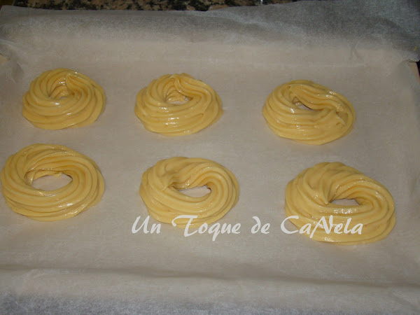 Poner en manga pastelera con boquilla rizada y formar los Zeppole en bandeja de horno con papel vegetal.