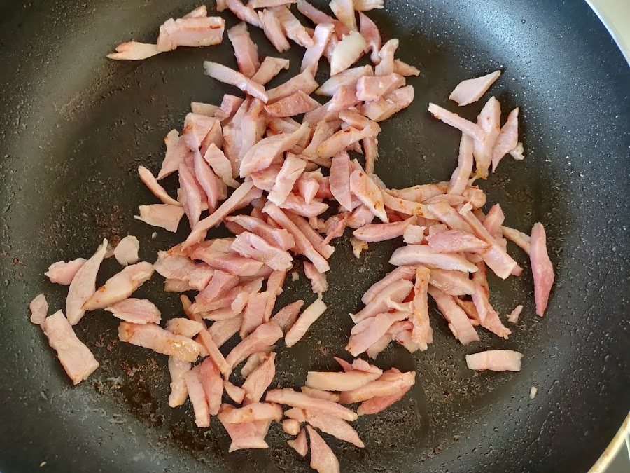 Empezaremos cortando el lacón a tiras y lo pasaremos por la sartén con un poco de aceite para que se dore. Reservamos.