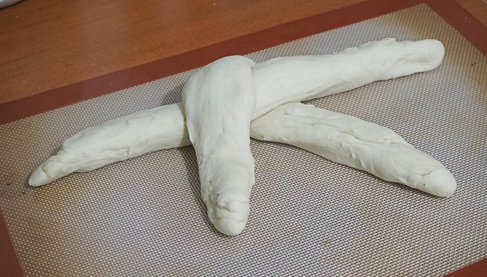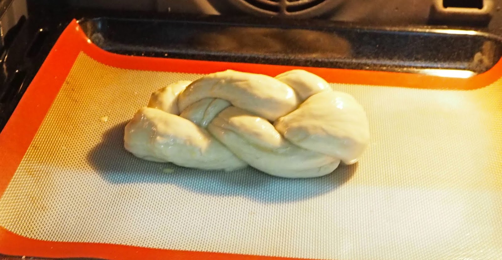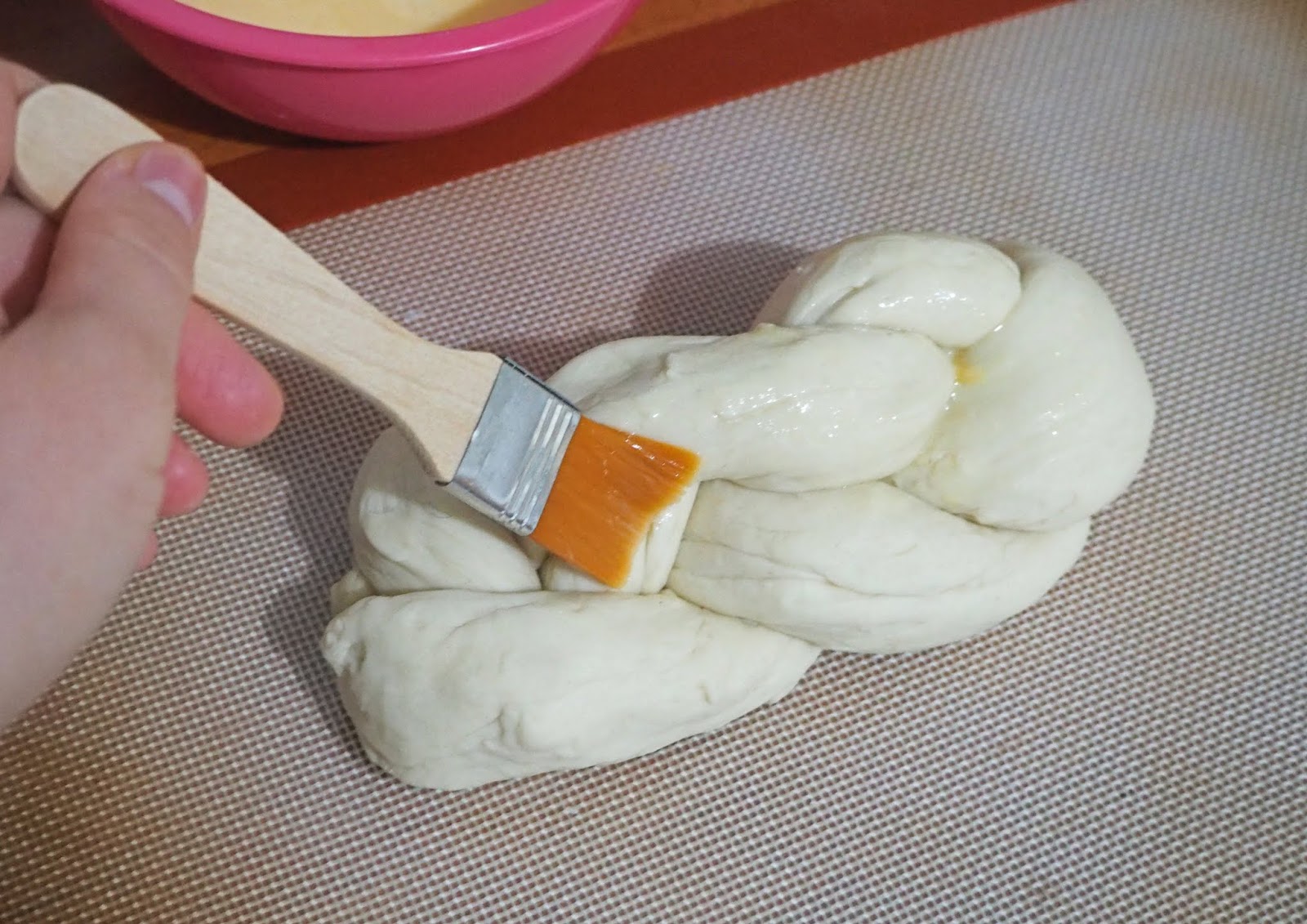 - Mezclamos la yema y la cucharada de leche extra e un bol y pintamos la trenza. La dejamos reposar en un sitio cálido media hora.