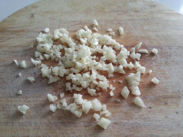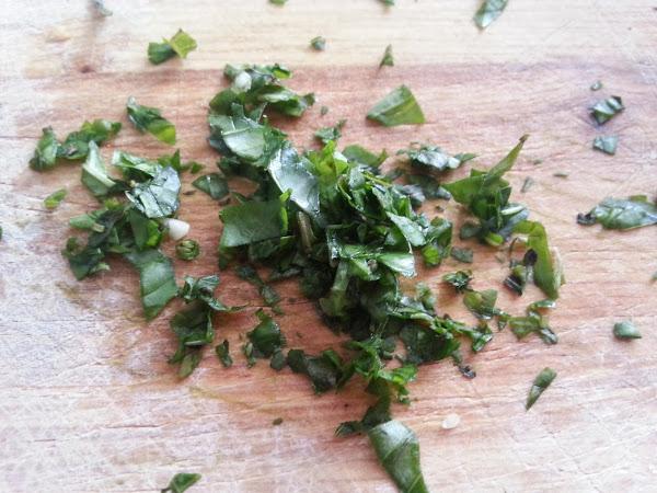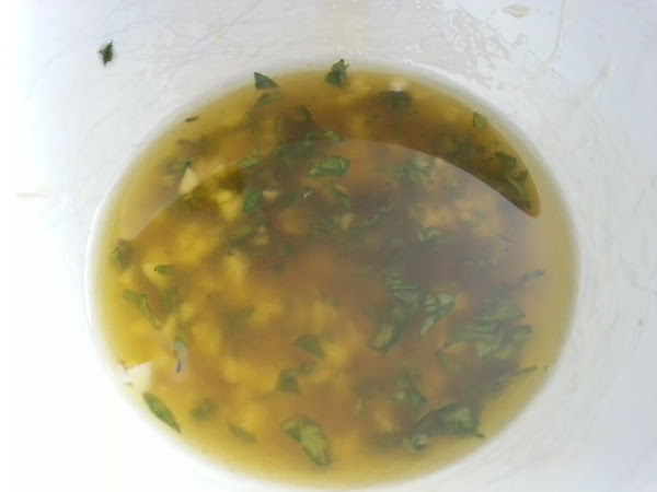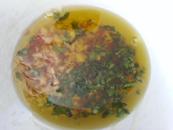 5. - En un cuenco echamos el ajo, la albahaca, la sal, el aceite y el vinagre y lo batimos con un tenedor, para que quede todo ligado.