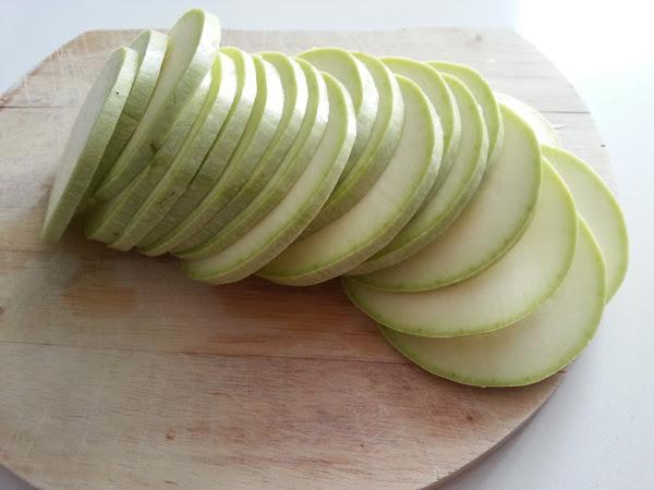 1. - Lavamos bien el calabacín por fuera, ya que lo vamos a hacer con la piel, y los cortamos en rodajas finas.