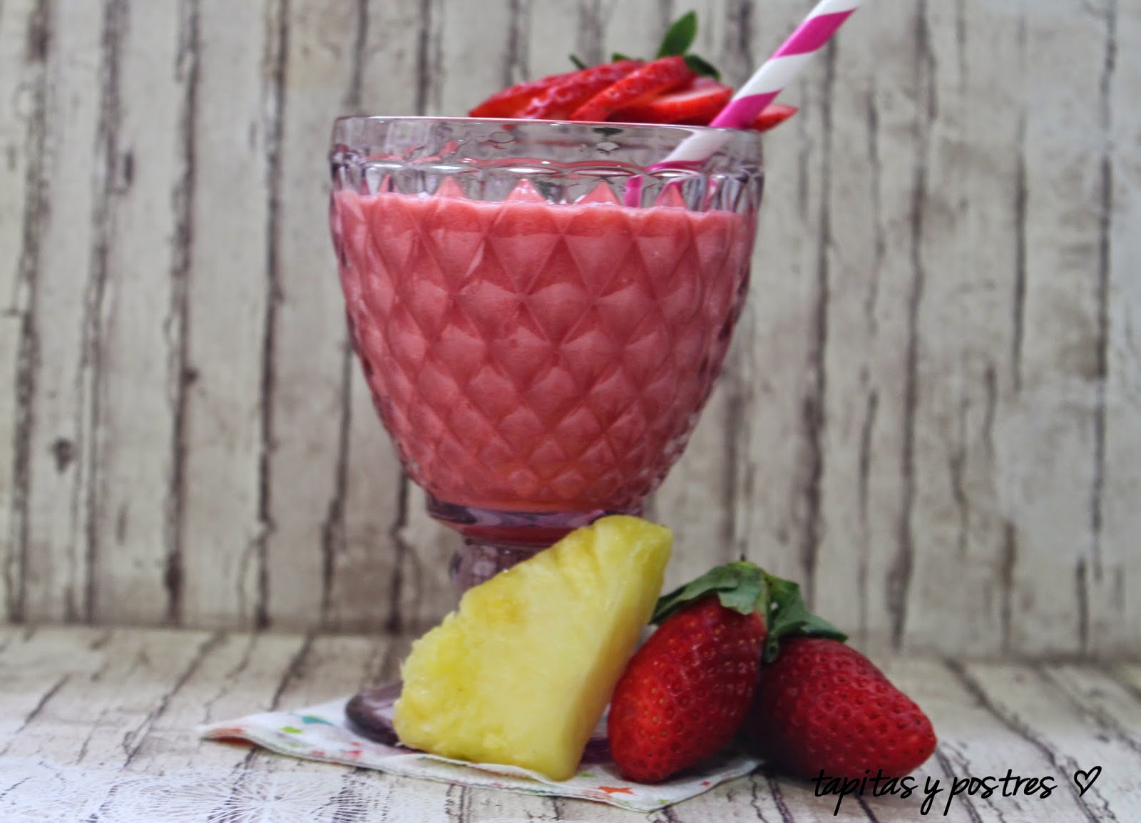 ¡Que bueno está este zumo de fresa y piña! Yo que no salgo del clásico zumo de naranja, me ha sorprendido mucho. Sin nada de azúcar, ni leche, totalmente natural. Un zumo de aspecto cremoso, casi un batido, aunque, como ya he dicho antes, no lleva nada de leche.