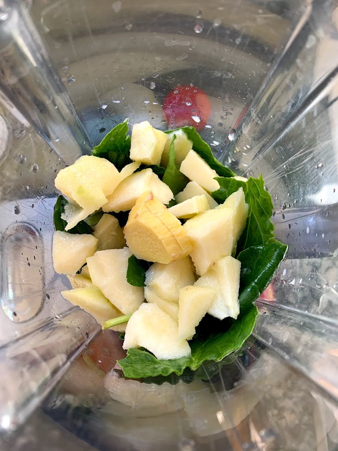 Pelamos y cortamos la manzana a trocitos, trituramos junto los demás ingredientes. Servimos al momento así no pierde propiedades.Si lo prefieres frío se pueden congelar previamente la fruta o las verduras o bien en vez de agua poner hielo o agua/leche fría.